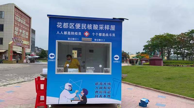 5月23日,花都區(qū)添置第一批5個(gè)專用核酸采樣屋,分別放置在來又來商場、新世紀(jì)廣場、融創(chuàng)樂園、雅樂城廣場、花東市場,當(dāng)天下午3時(shí)正式投入使用,受到市民群眾的熱烈歡迎,這也是 廣州市第一批專用核酸采樣亭。