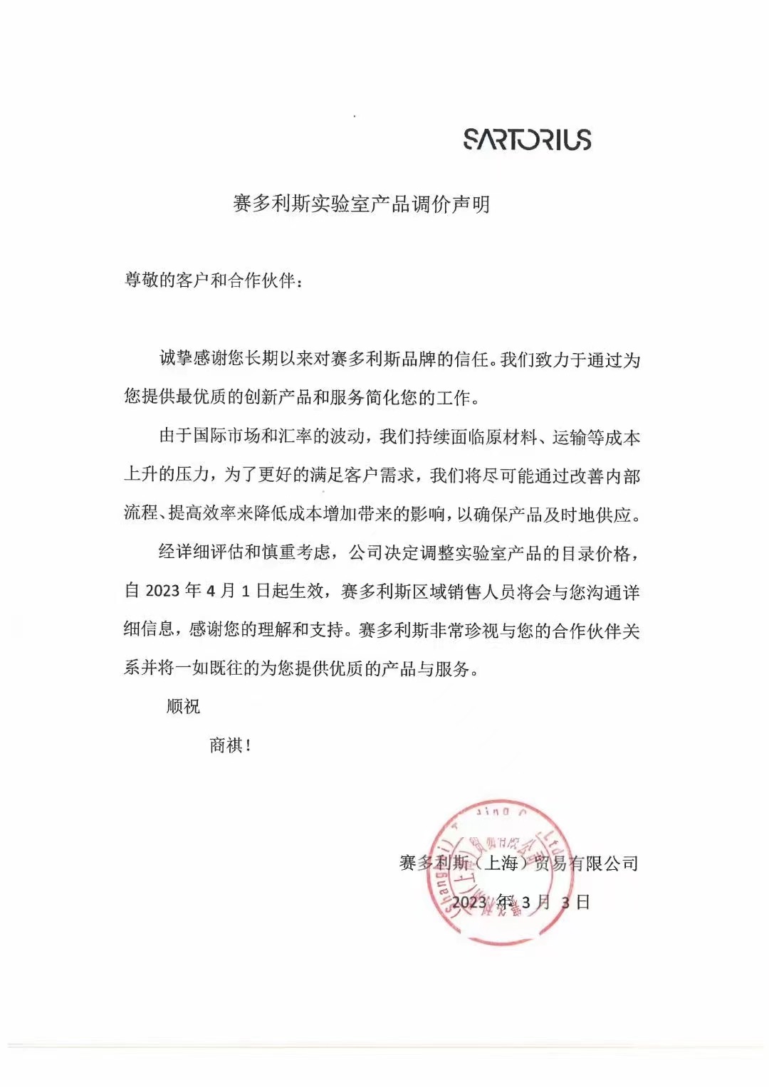 賽多利斯將于2023年4月1日起執(zhí)行新價格